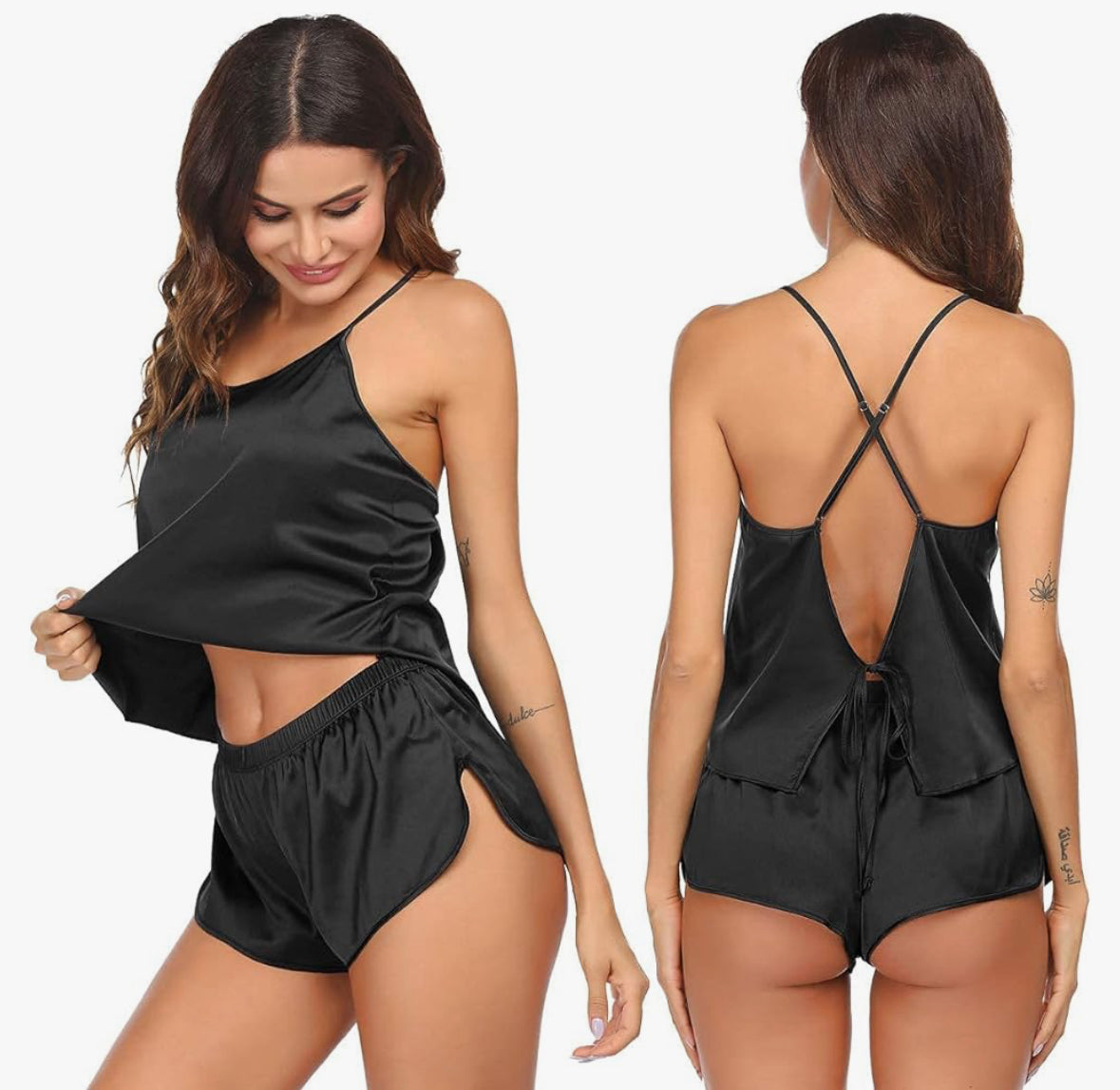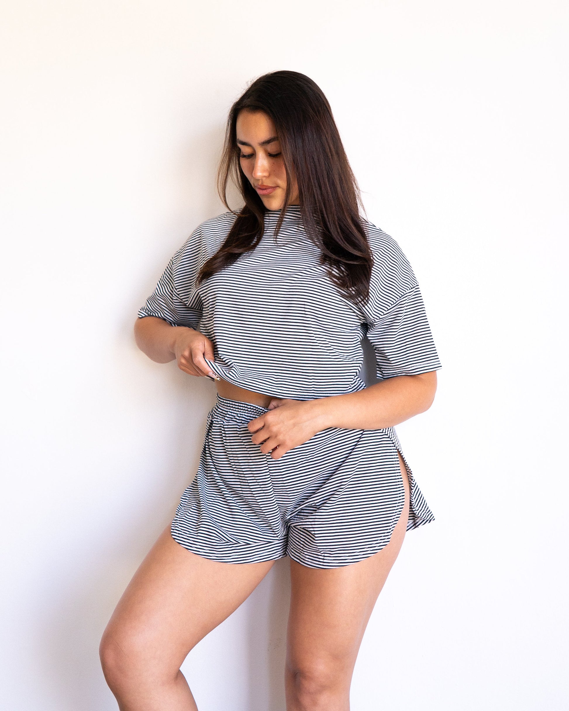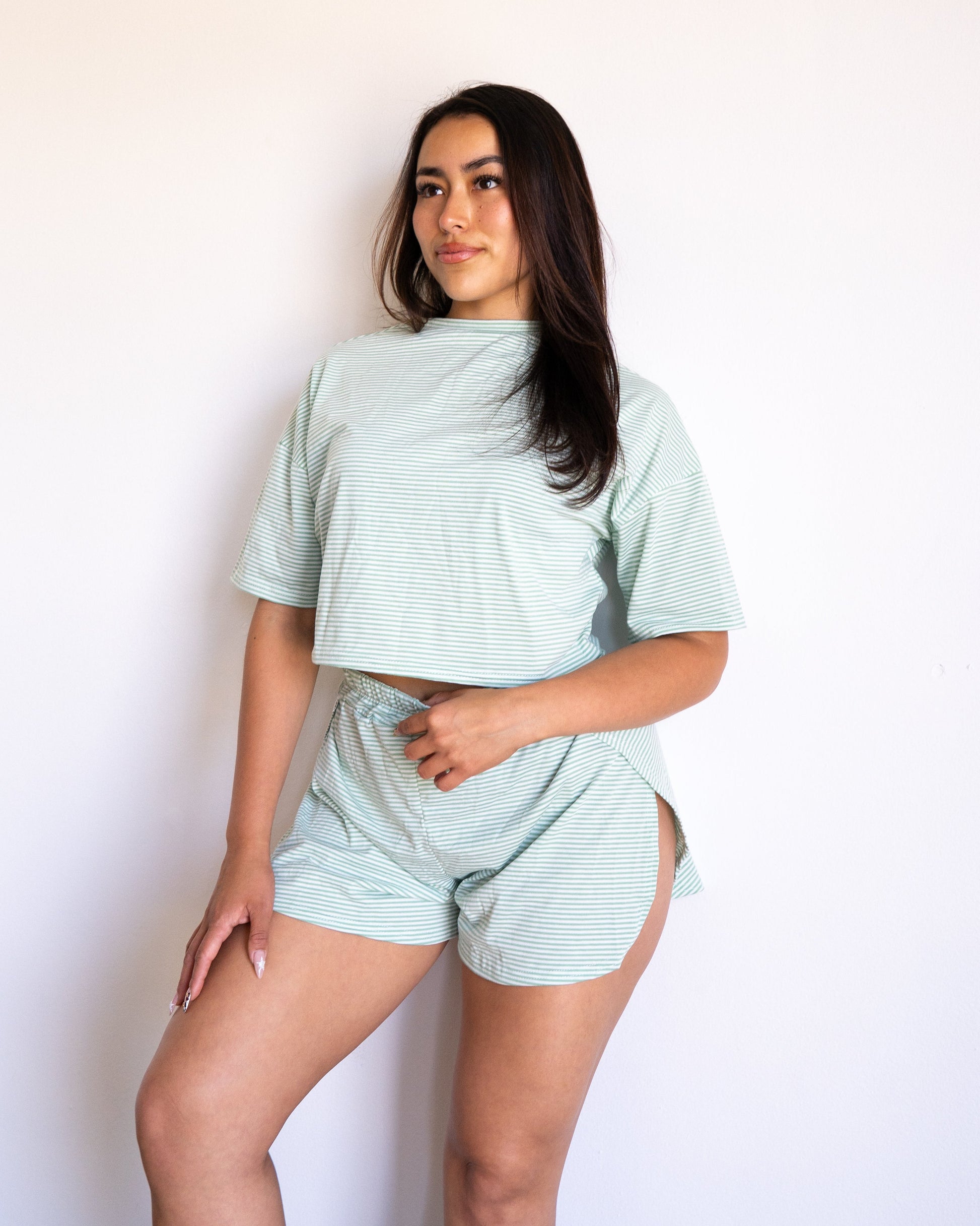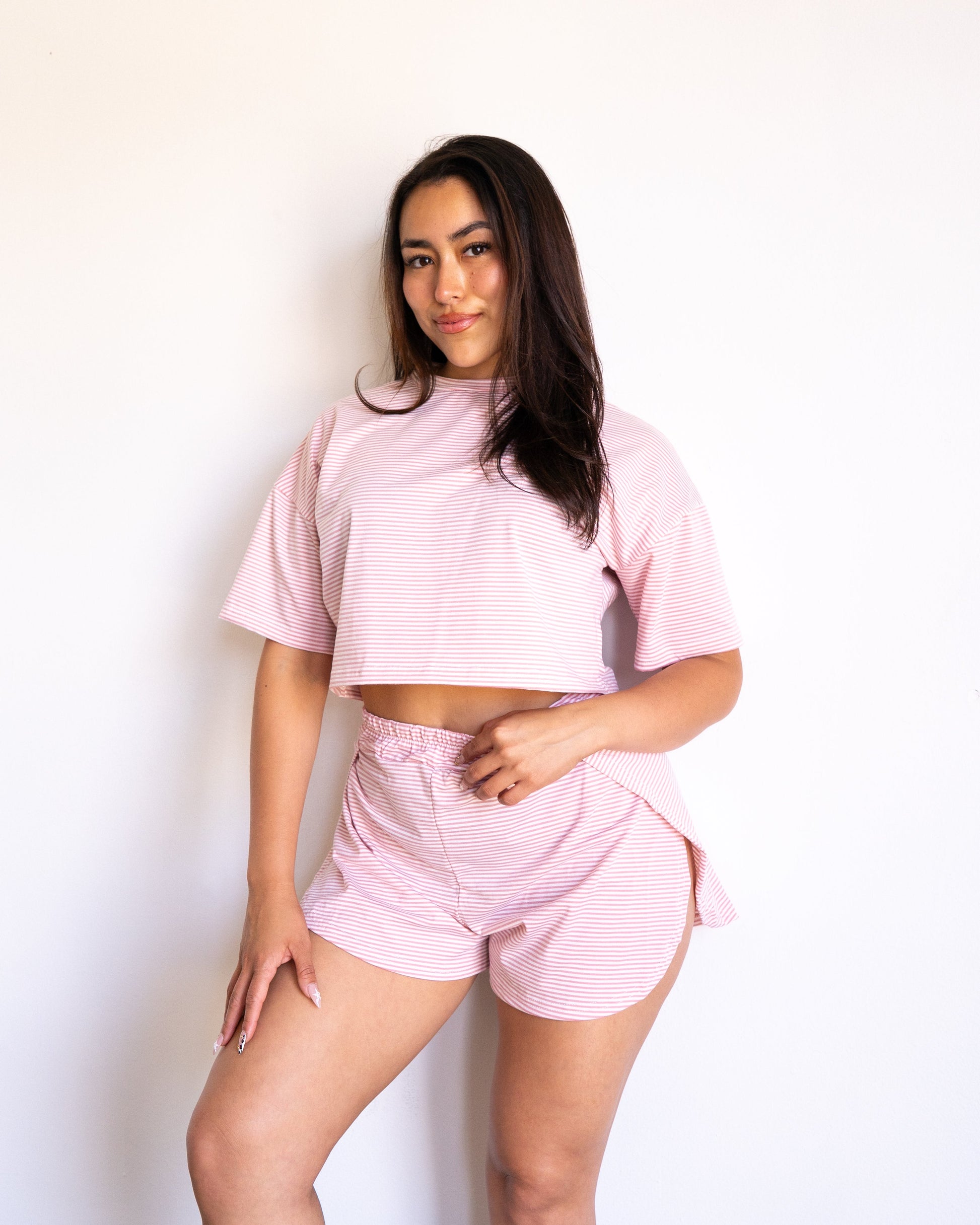 Built in Cheeky Shorts with a lightweight cutesy top. This set has you feeling sexy and looking good throughout the day, especially at home.