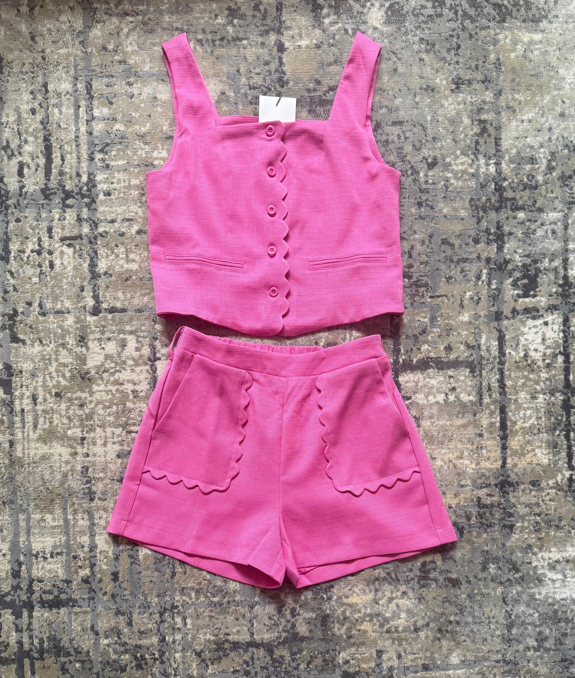 The Alexandra Set is your go-to for an elevated and effortlessly stylish summer look. This chic two-piece set features a structured, button-up vest with wide straps, princess seams, and delicately scalloped edges for a feminine yet modern silhouette. Faux front pockets add a touch of tailored charm.