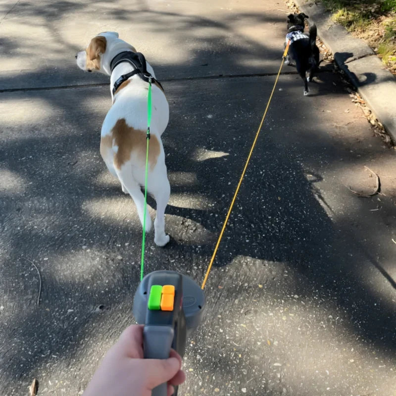 The Dual Doggie Retractable Leash lets you walk two dogs at once—tangle-free and hassle-free. Its smart design features a built-in swivel mechanism that automatically prevents the leashes from twisting, so you can enjoy smooth walks without constant stops.