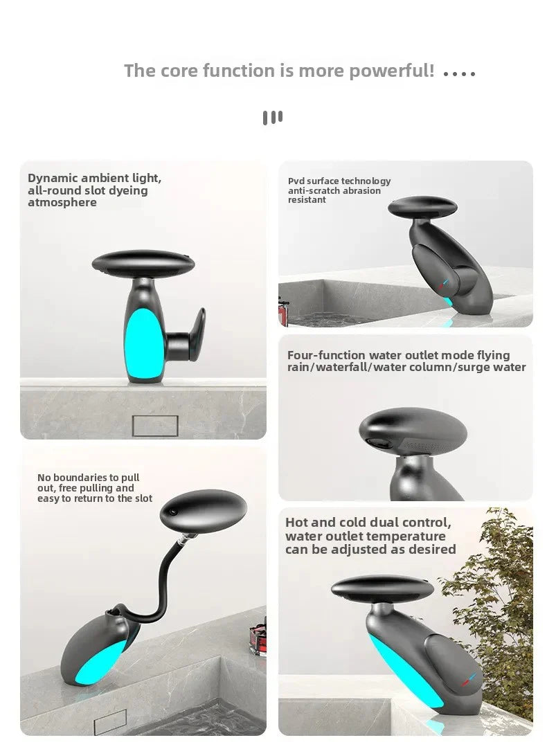 Enhance your bathroom with the LumiFlow Faucet by EvenShe™, combining contemporary design with practical functionality. Featuring four water modes, a 360° pull-out spout, and calming six-color LED illumination, it offers a sophisticated fusion of technology and style. The robust gun gray finish resists fingerprints and scratches, while the intuitive hot/cold slide control ensures effortless temperature adjustment. Perfect for rinsing, washing, or filling, LumiFlow seamlessly integrates into your daily routine, making it an excellent choice for modern households and discerning users.