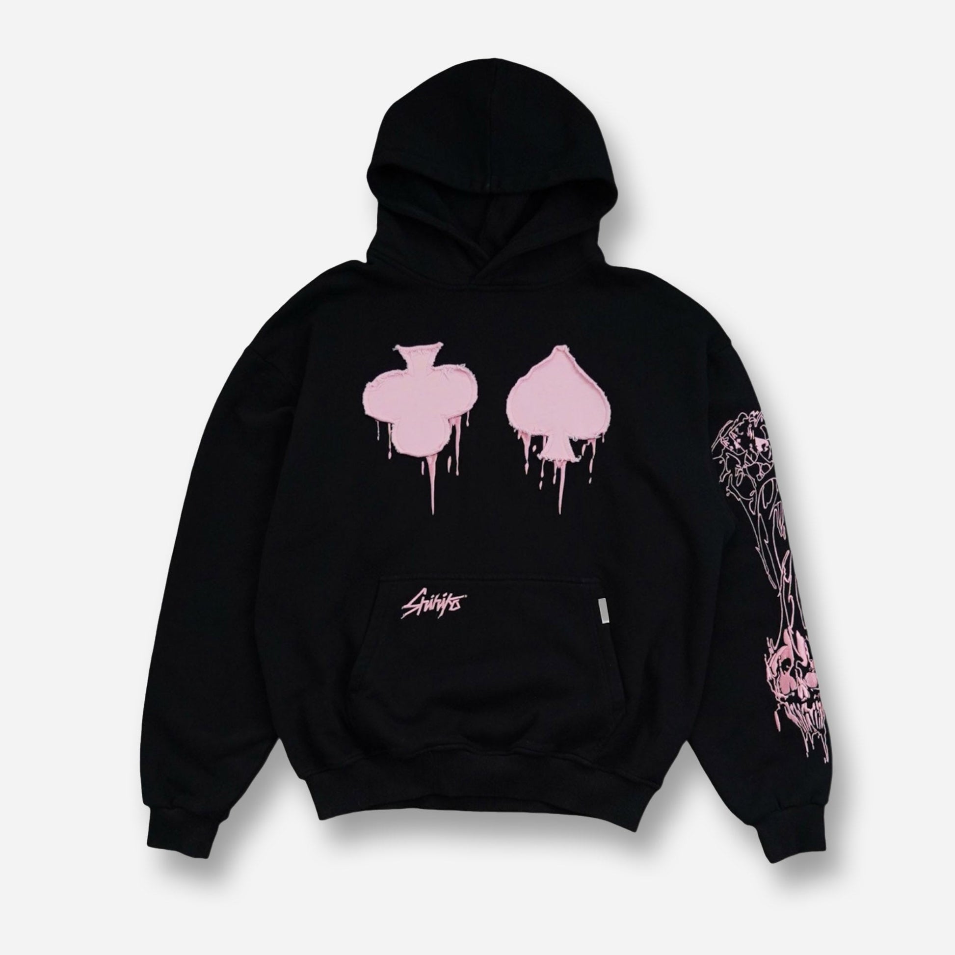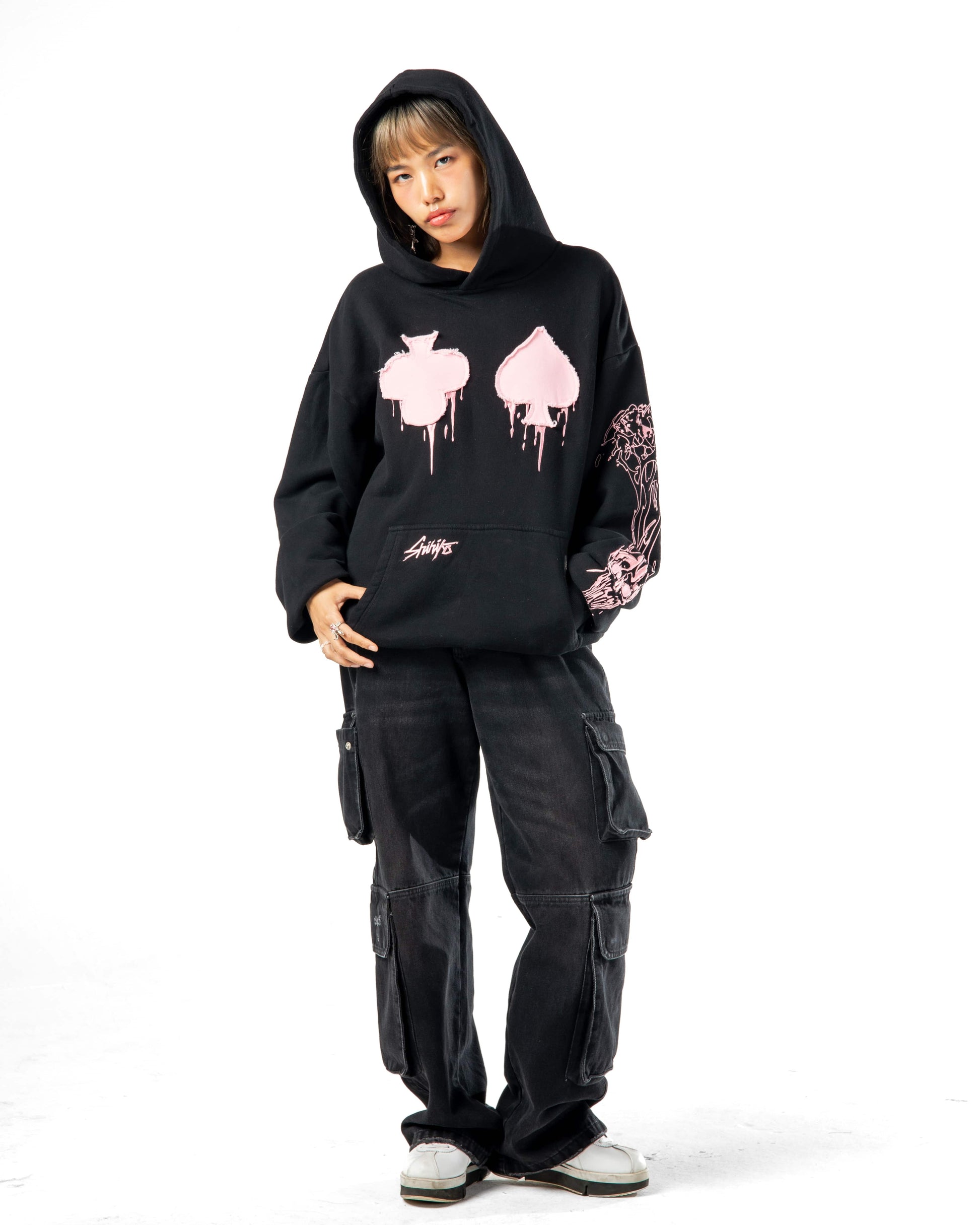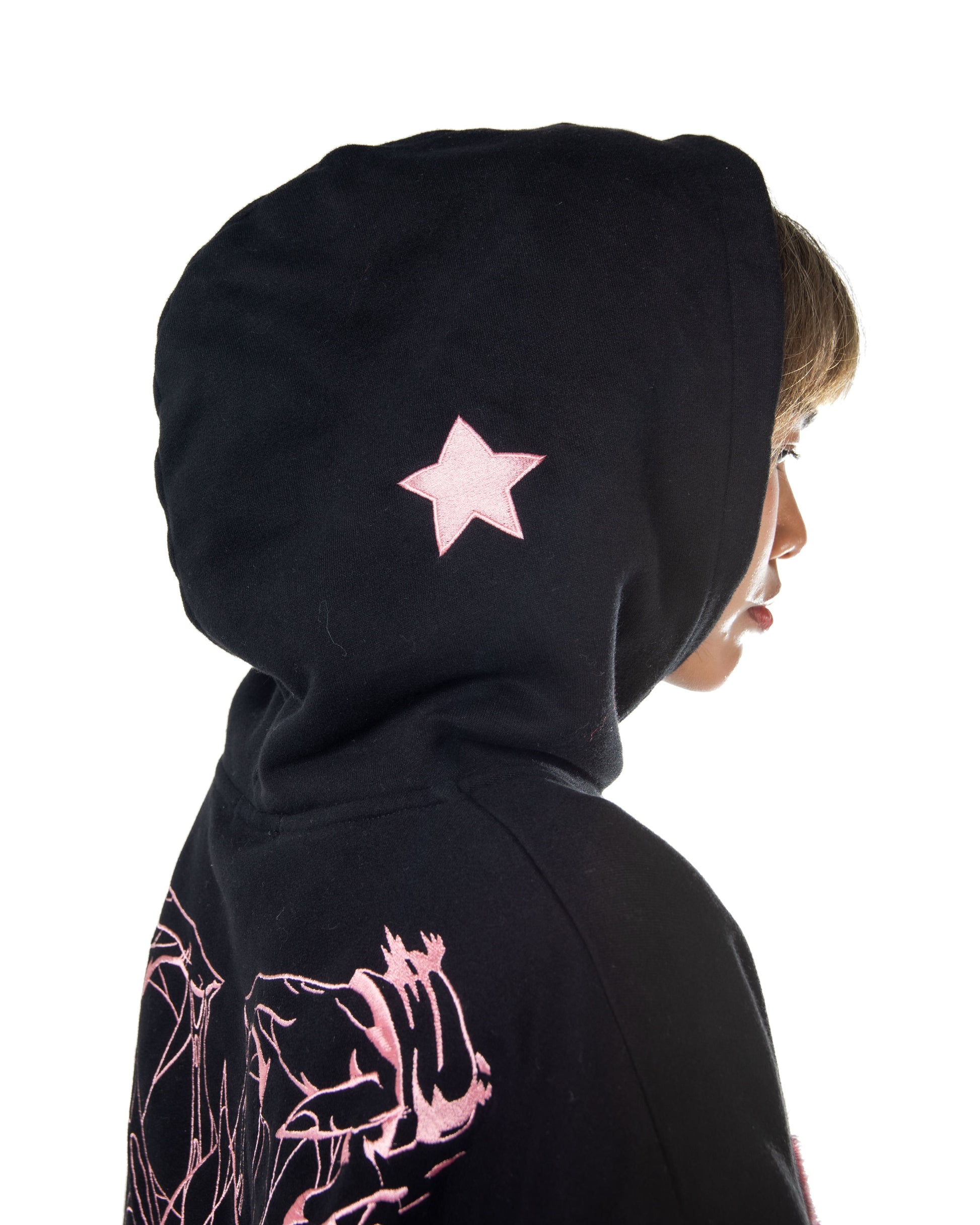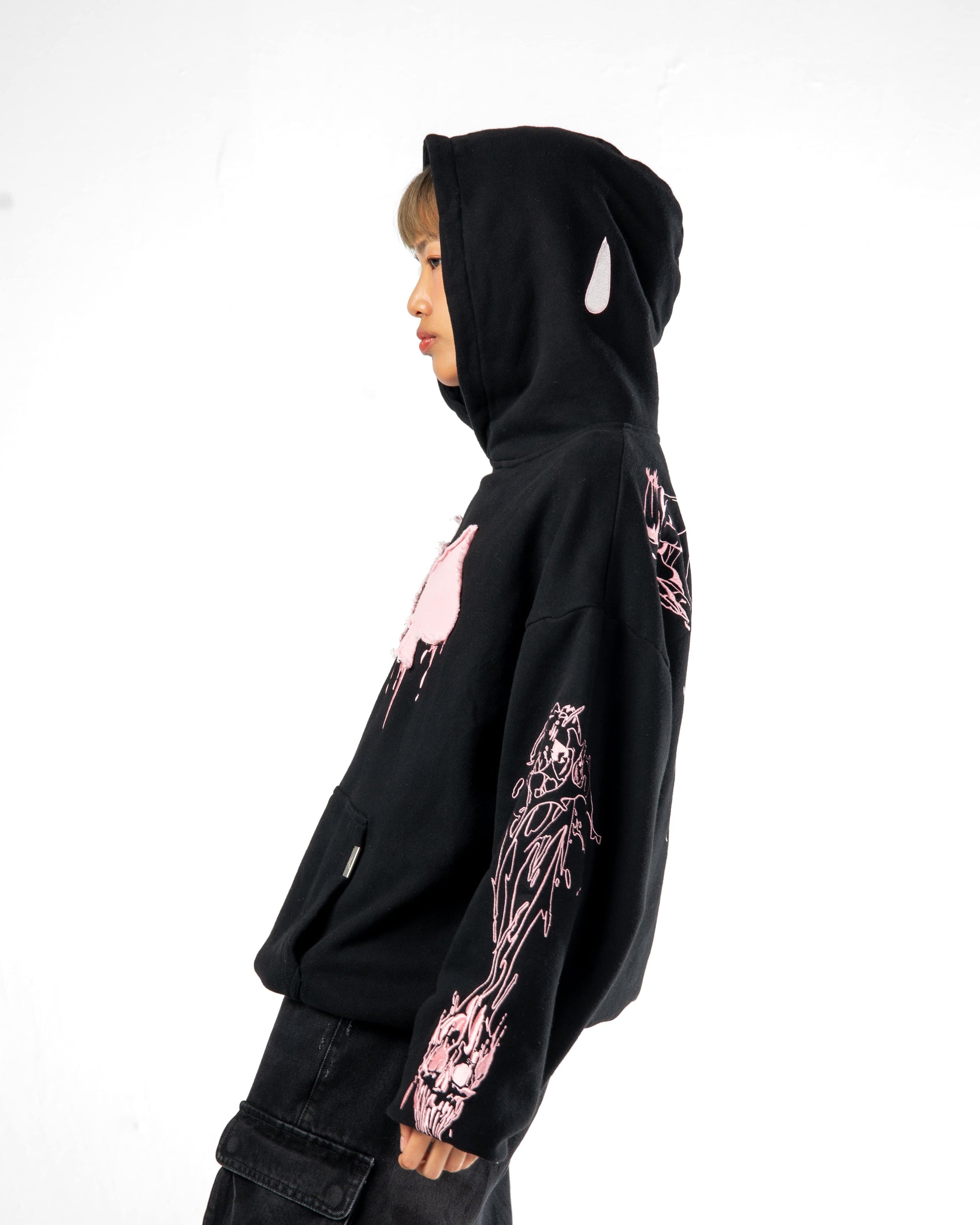 Rubber & Gum Hoodie in black is crafted from luxury heavyweight cotton, with an oversized fit and drop shoulders. It features a large embroidery on the back, front and sleeve. The hoodie has ribbed hems and cuffs.