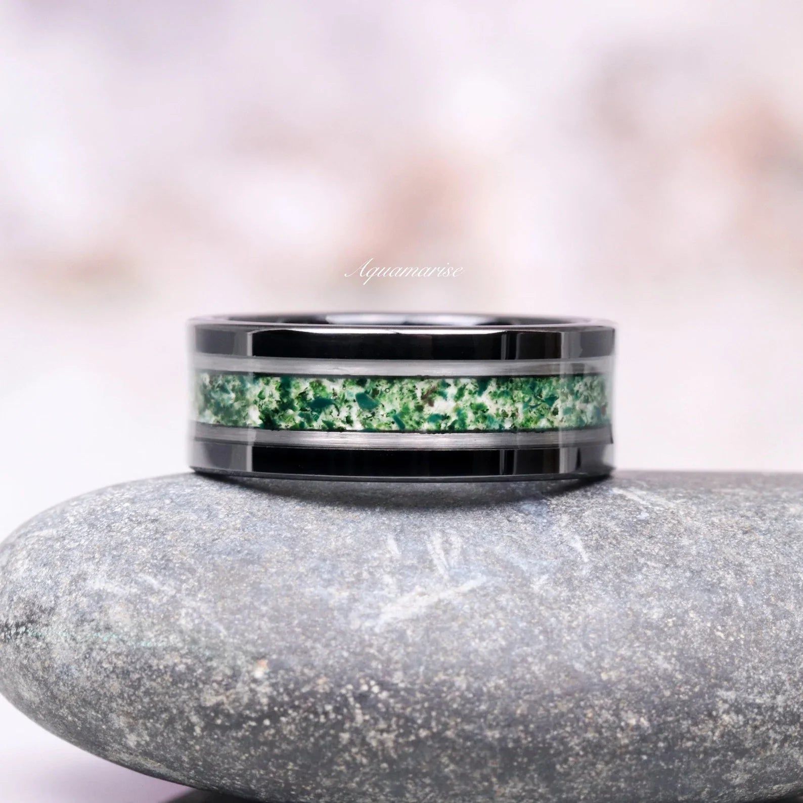 ►His ring is polished black tungsten carbide with silver strip and natural green moss agate inlay.