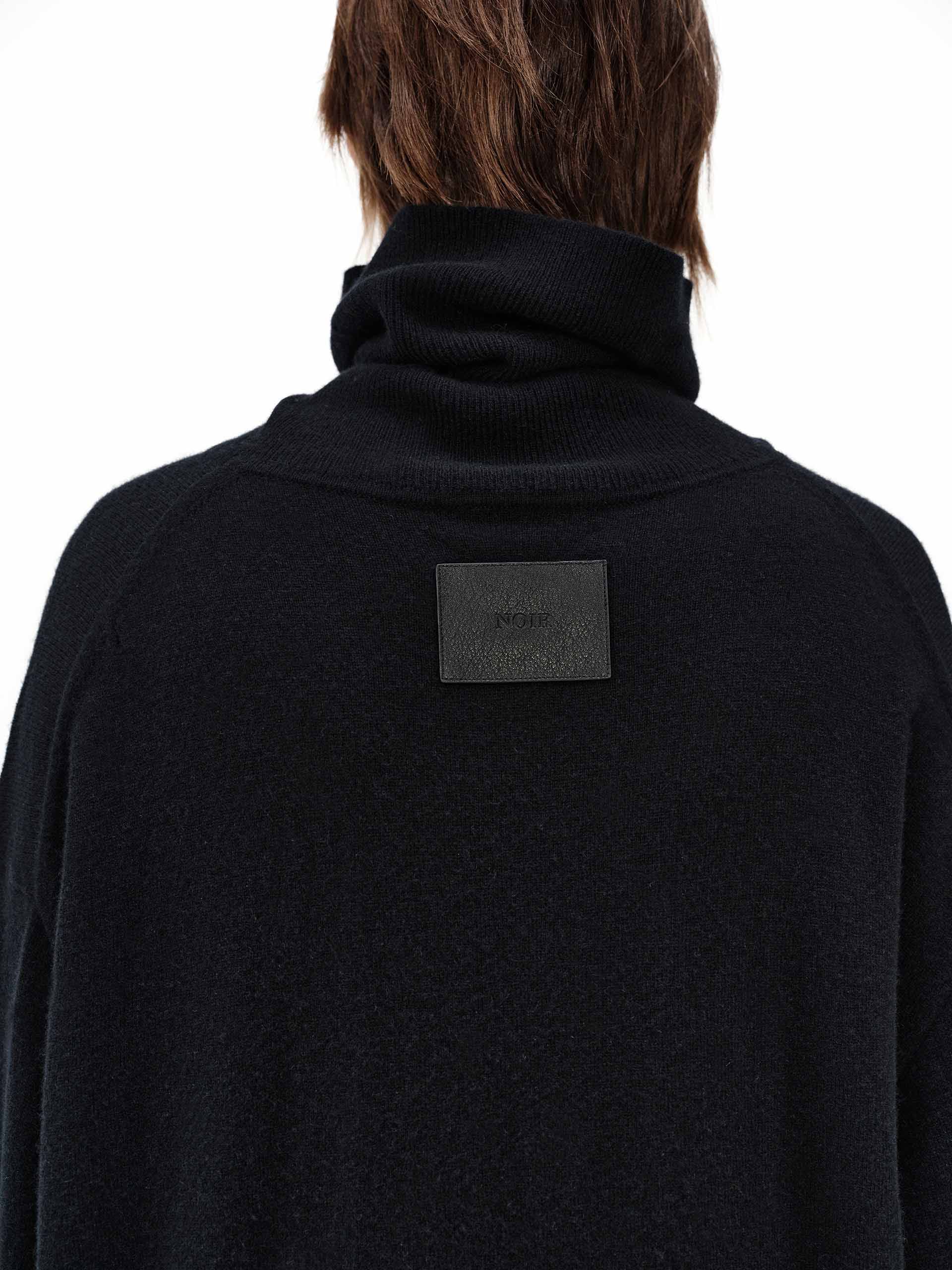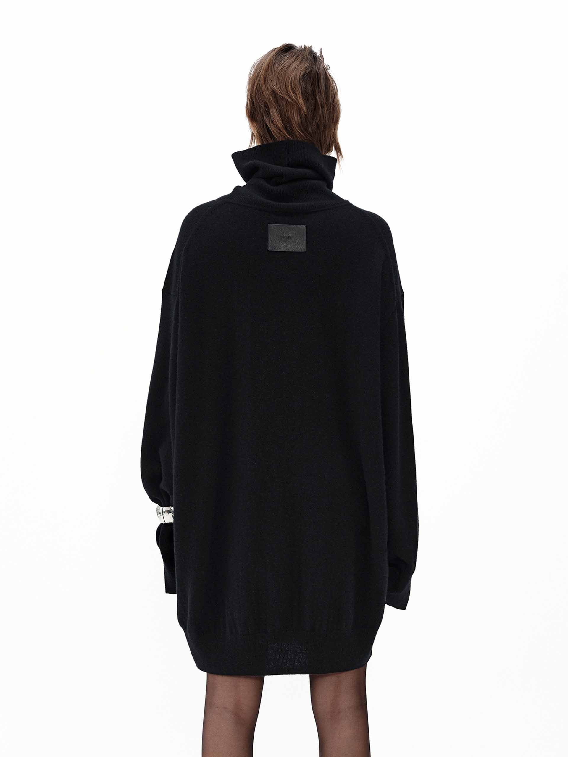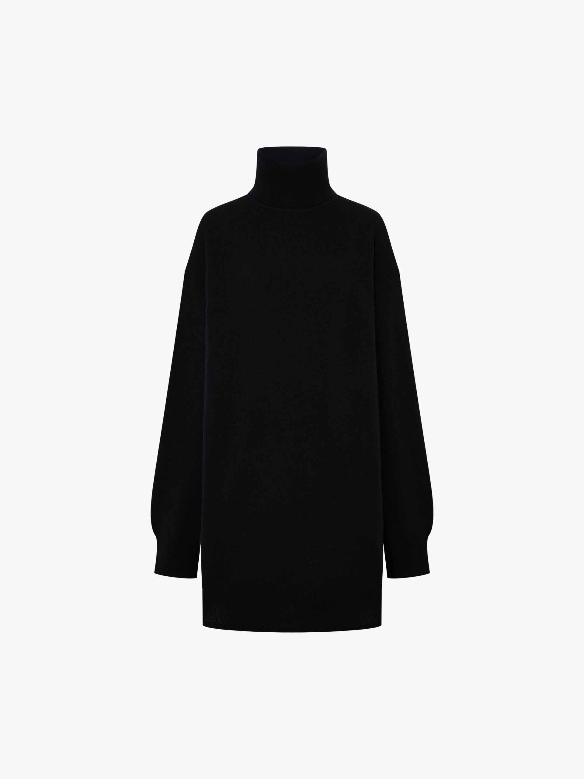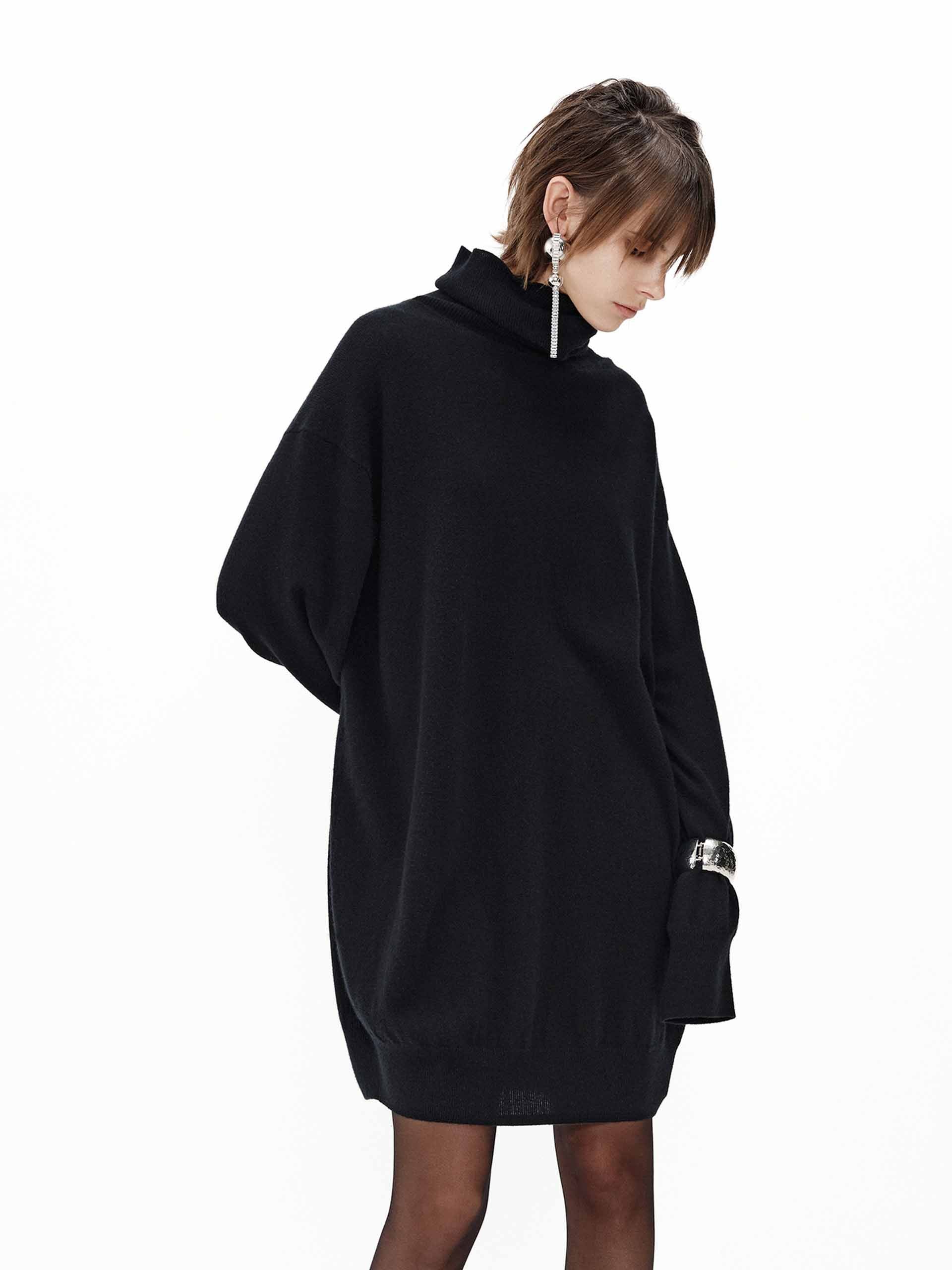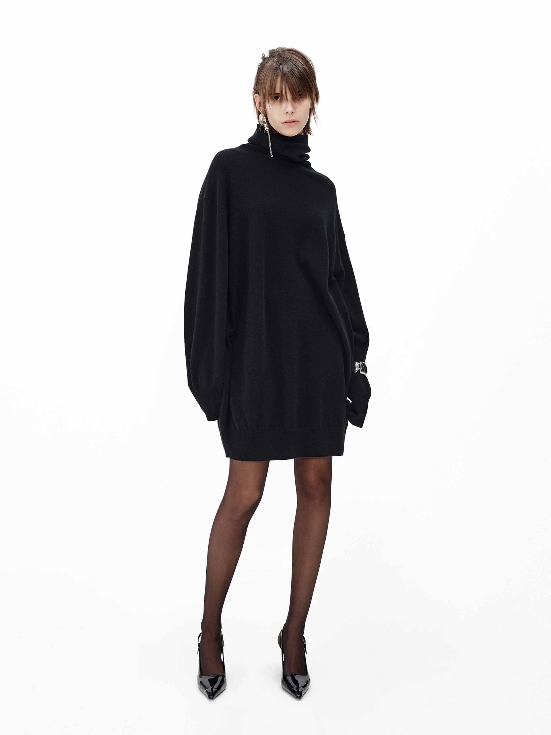 Designed with a distinctive cocoon shape with a mini length, this modern dress is rib-knitted from premium wool and cashmere. It has a high roll-neck collar and drop shoulder, pair it with your short boots.